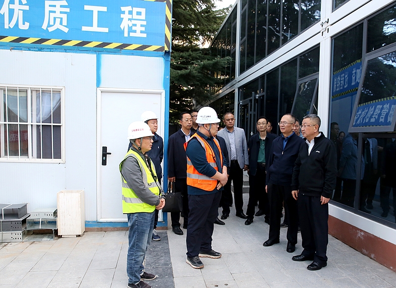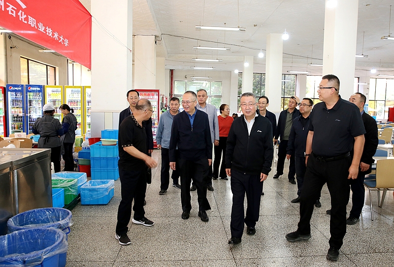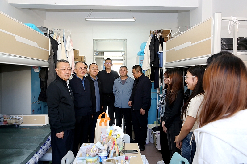 徐宏伟一行先后深入教学场所、实验实训室、学生宿舍、食堂、在建工程工地等重点区域,聚焦校园安保运行、楼宇消防安全、用电规范、食品卫生安全等关键环节,通过实地查看设施状态、现场问询管理细节、查阅台账记录相结合的方式,对安防监控系统运行情况、消防设施完好度、电器使用合规性及食堂卫生管理状况进行逐项细致核查。在应用化学工程学院办公区,徐宏伟与教师亲切交流并提醒师生假日期间要提高安全防范意识,同时叮嘱值班人员要加强巡查,确保校园安全。在学生宿舍,徐宏伟详细了解学生思想状况和假期去向,及时开展安全教育和提醒,叮嘱学生离校前锁好门窗、切断电源,保管好贵重物品,并嘱咐留校的同学要注意宿舍用电安全。在食堂,徐宏伟详细检查了食堂卫生、食品储存、用具消毒及燃料使用管理等环节,强调必须严格执行食品安全制度,严防用火用电安全隐患,严密做好假期食堂安全工作。在工地施工现场,徐宏伟同项目管理人员进行了交流,要求施工单位切实做好施工全流程安全管理,切实堵牢安全漏洞。